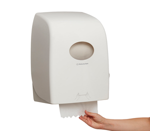 The Aquarius® hand roll towel dispenser is part of the Kimberly-Clark Professional® coordinated washroom dispenser range, created to promote hygiene, improve comfort and reduce costs. Dispensing single sheets at a time, this touchless hand towel dispenser reduces contamination and the spread of germs in busy washrooms.
